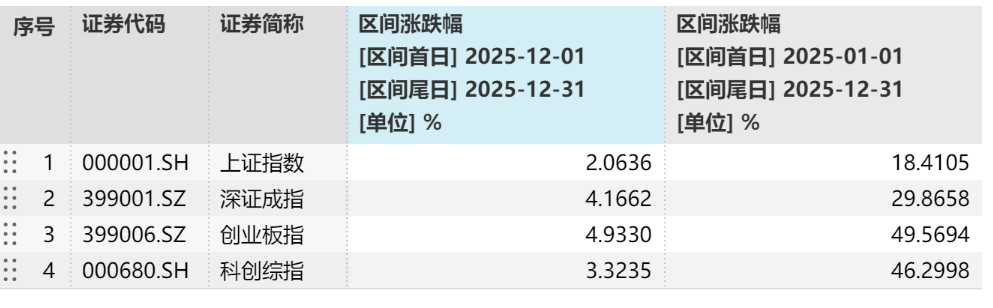数据显示,2025年12月,上证指数、深证成指、创业板指、科创综指分别上涨2.06%、4.17%、4.93%、3.32%。2025年全年,上证指数、深证成指、创业板指、科创综指分别累计上涨18.41%、29.87%、49.57%、46.3%。