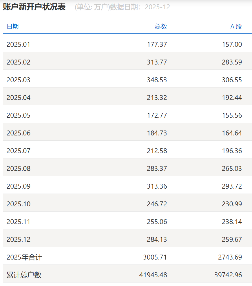 具体来看,2025年1月至12月,上交所A股新开户总数分别为157.00万户、283.59万户、306.55万户、192.44万户、155.56万户、164.64万户、196.36万户、265.03万户、293.72万户、230.99万户、238.14万户、259.67万户。